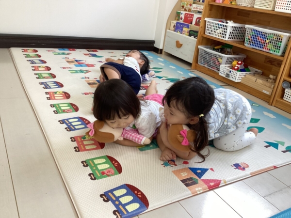 お人形遊びでは、抱っこしていた赤ちゃんが眠ったので、そ~っと起きないように寝かせている姿が見られました(*^^*)