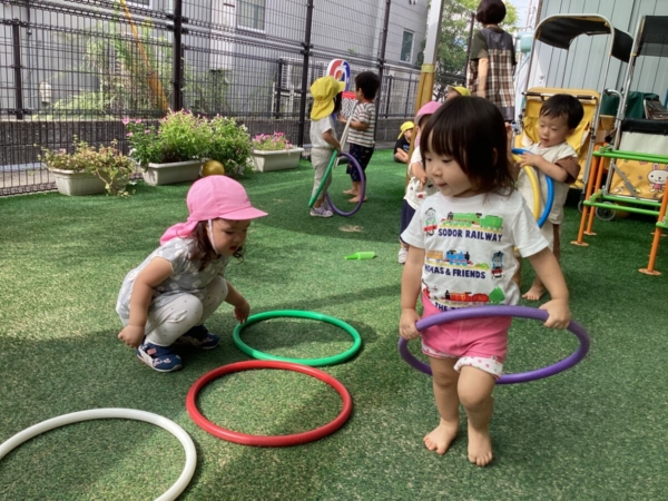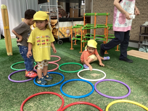 戸外遊びでは、園庭にフープを自分たちでたくさん並べてジャンプしてみたり、歩いてみたりと、いろいろな遊び方で楽しんでいました。お友だち同士で「こうしてみようか」と話しながら楽しむ姿も見られましたよ🎵