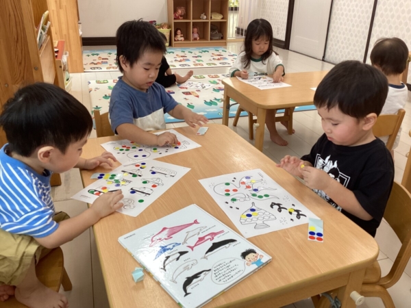 シール貼りをしました。海の生き物や乗り物などの3種類の台紙から好きなものを選んで楽しみましたよ。シールを貼る時には、○に合わせて貼るのですが、ずれないように上手に合わせて貼ることが出来ていました。色も考えながら貼っていて感心しました(*^^*)
