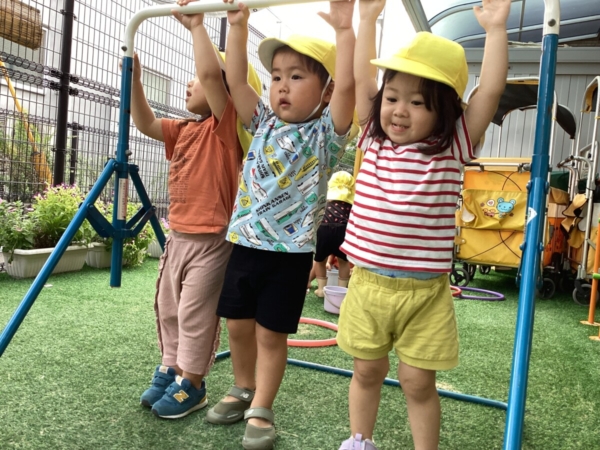 鉄棒のぶら下がりでは、足が地面から上がると「できた~!」と大喜び。お友だちと交代しながら繰り返し楽しんでいましたよ。腕の力、足の力などいろいろな力がついてきましたね!