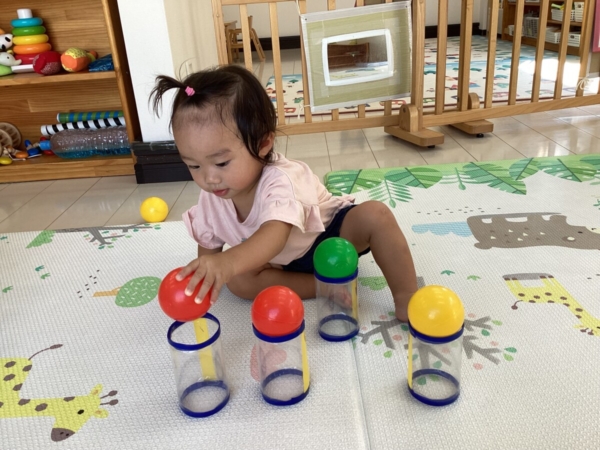 お部屋でもボールで遊び、筒の上に上手に乗せる姿が見られました!