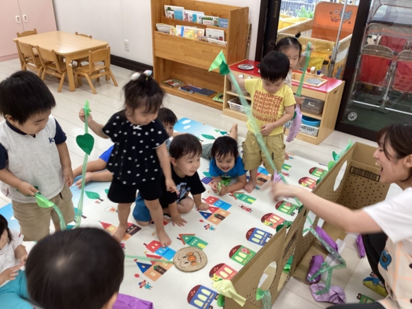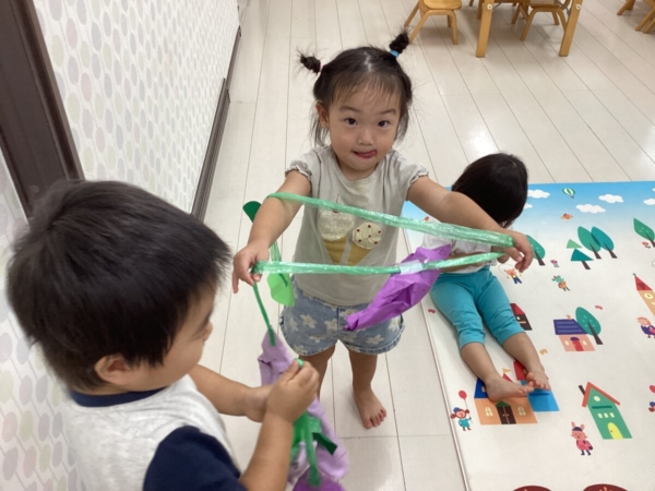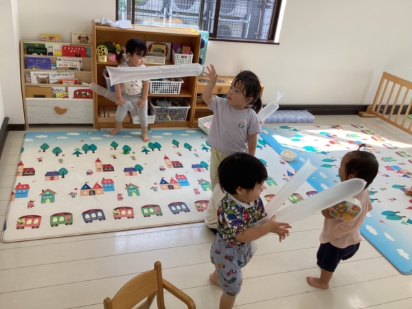 傘袋を膨らませてロケットで遊びました。保育者が見本で飛ばして見せると、子ども達も上手に前に飛ばすことが出来ていましたよ🚀