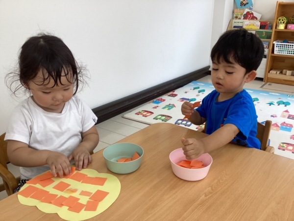 切り込みが入った画用紙を破ってちぎり貼り!「びりびり~」と言いながらちぎることを楽しんでいましたよ♪
