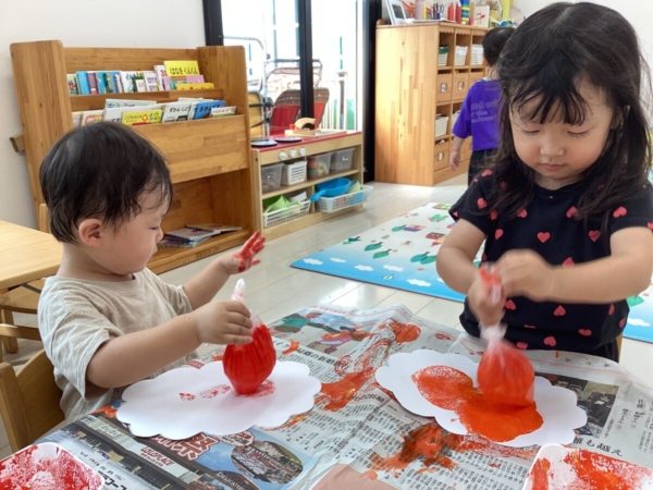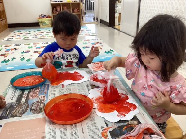 水を入れたビニール袋でスタンプをして紅葉の製作をしました。赤とオレンジ、オレンジと黄色で色を混ぜて紅葉を表現しましたよ🍂