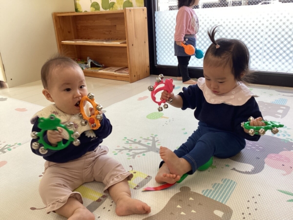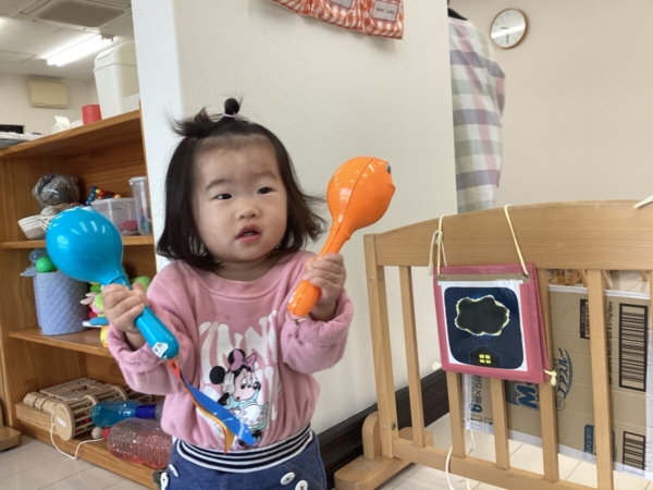 マラカス、タンバリン、鈴があり、好きな楽器を選んで遊びましたよ。