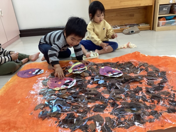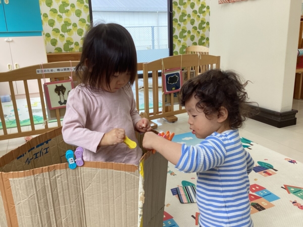 段ボールの端に並べて付けていて真剣な姿が微笑ましかったです(*^^*)