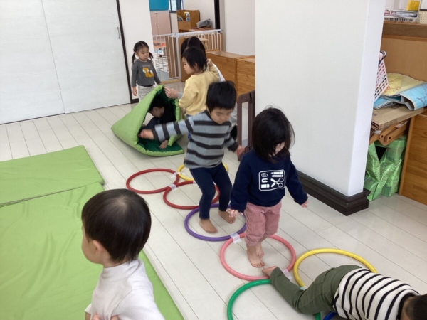 フープでは、リズムよくジャンプをしたり、タタタッと素早く走っていったりと元気いっぱいでした♬