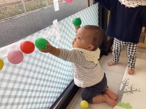 小さい風船をぎゅうっと握ったり、ポンポンと叩いてみたり楽しく遊ぶ子ども達(^-^)