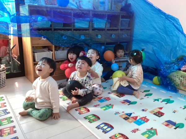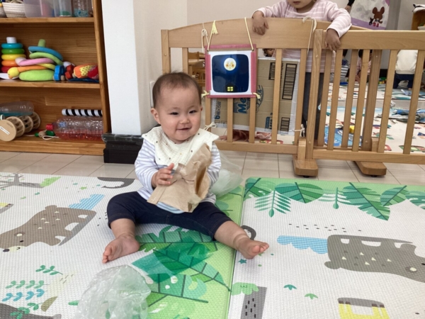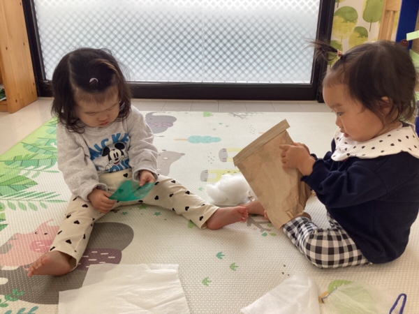 ポリ袋を出すと中に入って遊ぶのが大好きで、お友だちと玩具を中に集めてごっこ遊びをしたり