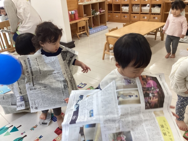 1枚の新聞紙を広げて「〇○ちゃんいないよー」とかくれんぼをしたり、ちぎったり