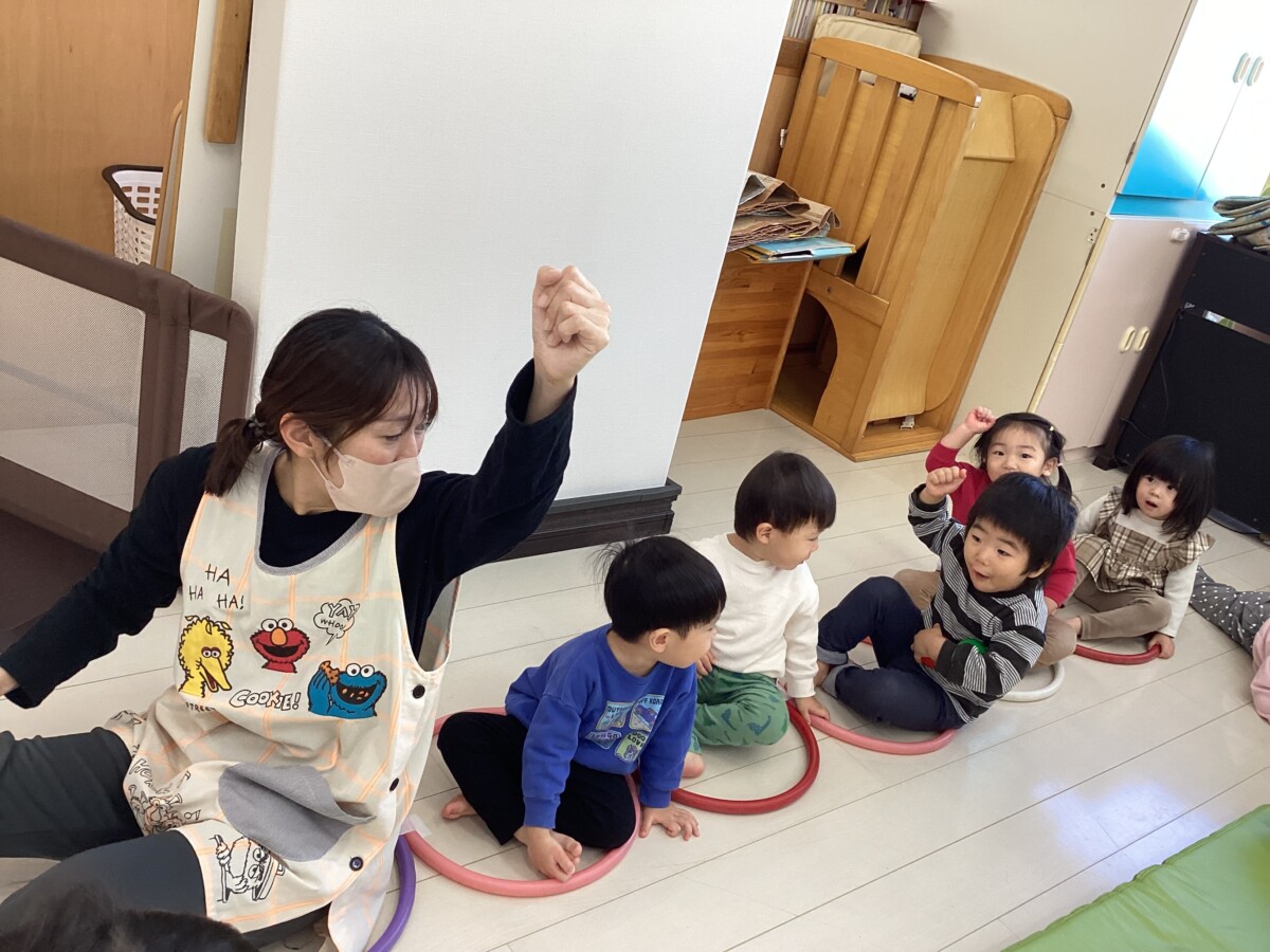 また並べたフープの上を走ったり、リズムよくとんだり、保育者が車掌さんになると「ダダンダンバイキンまで!」「ポケモンセンターに行ってください!」とそれぞれ行きたい目的地を言って楽しんでいましたよ。