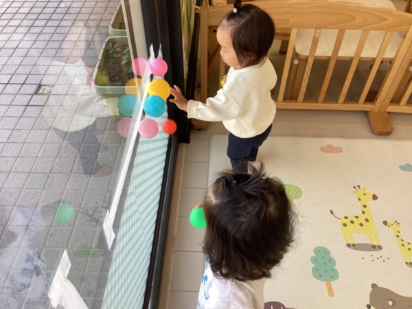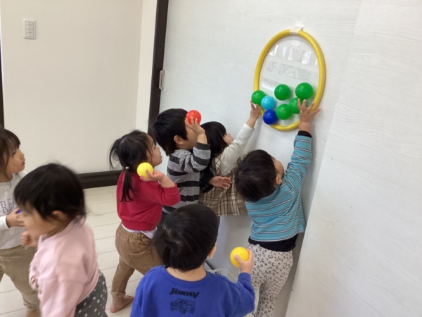 小さい風船をぎゅうっと握ったり、ポンポンと叩いてみたり楽しく遊ぶ子ども達(^-^)
