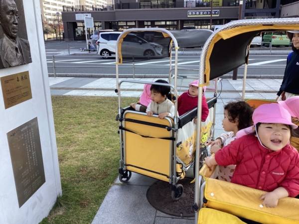 駅近くの森さんの銅像で保育者が真似をして「こんにちはー」等子ども達に声を掛けると