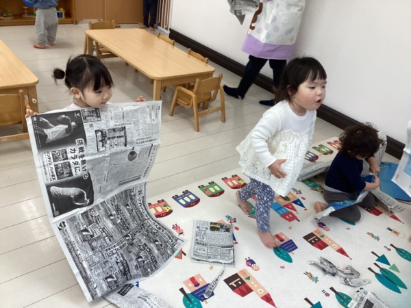 1枚の新聞紙を広げて「〇○ちゃんいないよー」とかくれんぼをしたり、ちぎったり