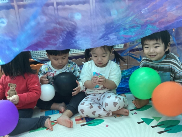 ポリ袋を出すと中に入って遊ぶのが大好きで、お友だちと玩具を中に集めてごっこ遊びをしたり