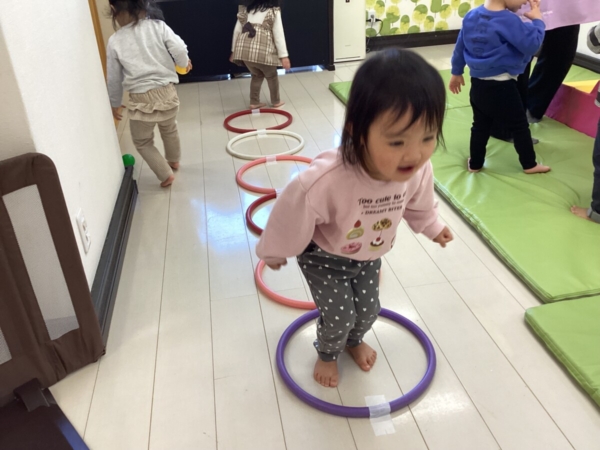 また並べたフープの上を走ったり、リズムよくとんだり、保育者が車掌さんになると「ダダンダンバイキンまで!」「ポケモンセンターに行ってください!」とそれぞれ行きたい目的地を言って楽しんでいましたよ。
