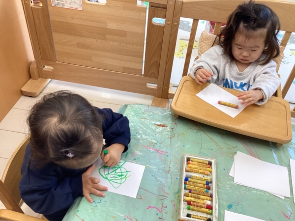 筆と黒の絵の具を使って、書初めに挑戦しました。丸を書いたり、「鳥の巣!」と書いたのを教えてくれたり、自由な発想で書初めを楽しんでいましたよ。文字に興味を持ち始めたお友だちもいて、数字や文字を書くようすが見られました!線が文字の形に似ているので見ていて楽しかったです!