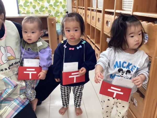 ハガキを郵便バックに入れて、配達に出発!にこにこ組さんに配達に行きました。