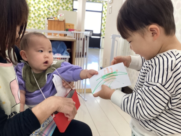 「やぎさんゆうびん」の歌をうたった後に、郵便屋さんごっこをしました。はがきサイズの画用紙になぐり描きをしたり、手型を押したりして年賀状を描きましたよ。可愛らしいお手紙が出来上がりました(*’▽’)