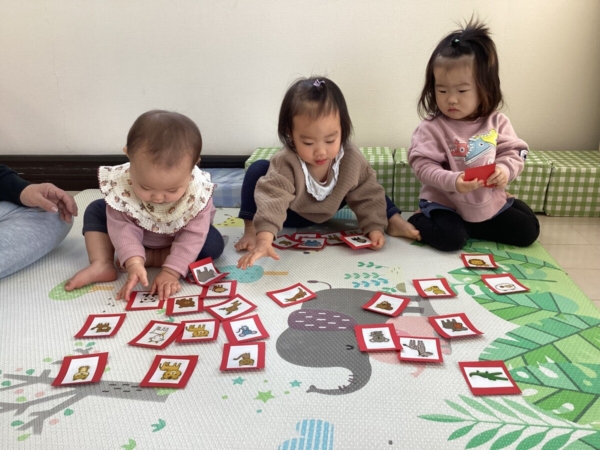 かるた遊びをしました。お友だちの前にかるたを並べて見せると興味津々!まずは保育者が「うさぎさんど~れだ?」「あった!」とかるたを取ってお手本を見せると、動物の絵のかるたをしっかり見つめていました。「ぞうさんど~れだ?」とお友だちに言うとみんな真剣に探していて、見つけたら「あった!あった!」と大喜びでした。(^_^)/