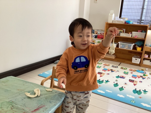 小麦粉粘土で遊びました。粘土遊びが大好きになり「粘土する! 粘土した~い!」という声がたくさん聞かれるようになりました。丸めたり、ちぎったり、のばしたり、とっても楽しそうに遊んでいましたよ。「お餅みたい」と嬉しそうに丸める姿も見られました(*^^*)