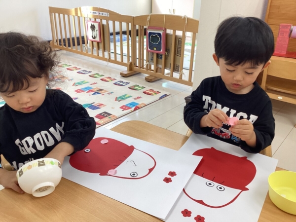 「だるまさんが」のペープサートを見た後に、福笑いをしました。パーツを用意すると「これは、おめめ、ほっぺ、鼻」と言いながら、思い思いに貼っていましたよ!まゆ毛がひげになったり、口になったりして面白かったです(*^^*)可愛らしいだるまさんがたくさん出来上がっていました。