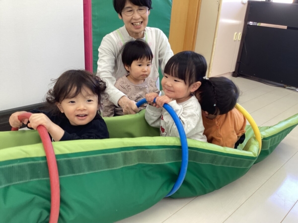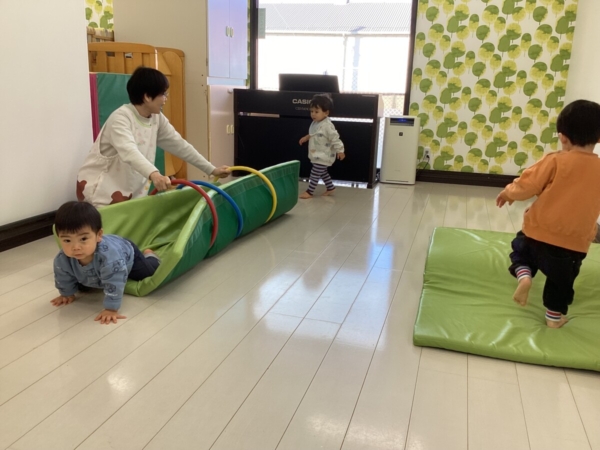 マットのお山と、マットとフープのトンネルでサーキット遊びをしました。くぐったり、のぼったり、たくさん体を動かして遊びましたよ。途中からトンネルをバスに見立てて、フープをハンドルにしてバスごっこが始まりました。「バスにのって」を歌うと、