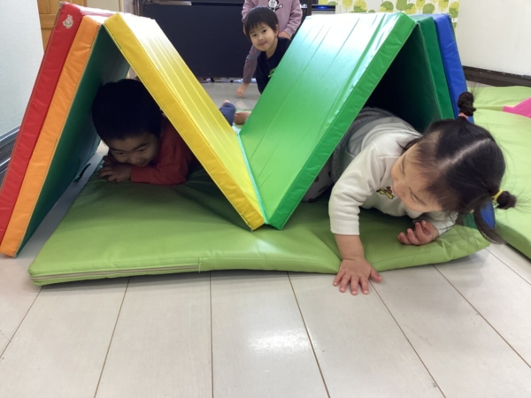 マット遊びをしました。レインボーマットでお山を2つ作ったら、「どっちに入ろうかな~♪」と選んでくぐっていましたよ(*^^*)