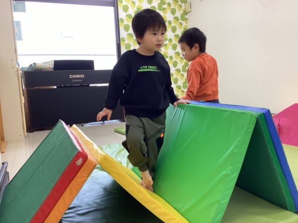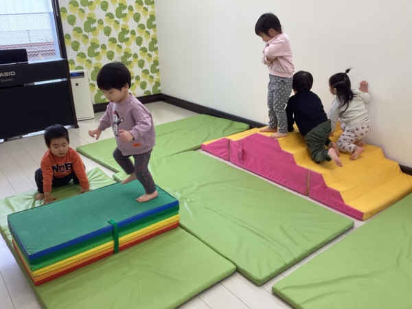 マットの形を変えて段差を作ると、ジャンプして楽しみました。たくさん体を動かして元気いっぱいでしたよ!