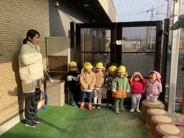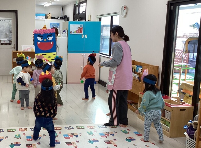 鬼のお面を窓に貼って、カラーボールを投げましたよ。しっかりに鬼にボールを当てる姿がありました(*^-^*)