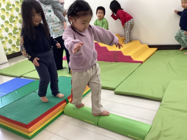 保育者がワニの真似をすると、両手を広げてバランスを取りながら渡ったり、恐竜になりきって渡る姿も見られましたよ(*^-^*)