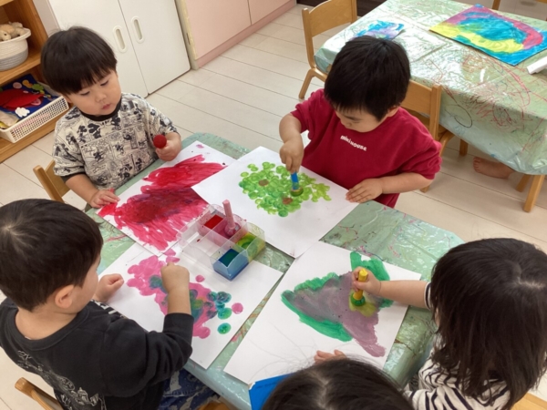 形が分かるようになってきて、丸の模様を組み合わせながら顔やおにぎりを描くお友だちもいて面白かったです☺