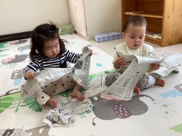 新聞紙で遊びました。保育者が切れ目を入れると、そこからビリビリと破っていましたよ☆