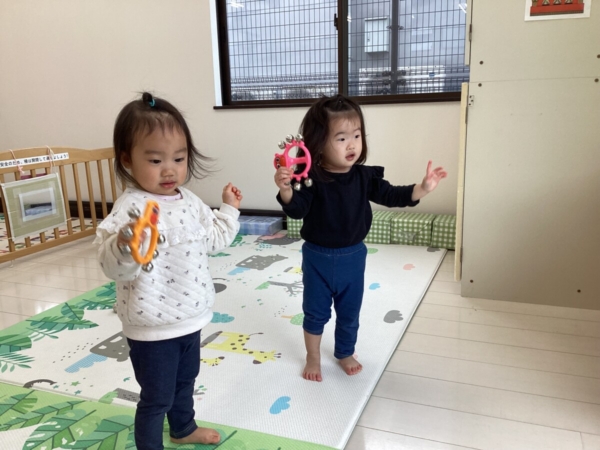 タンバリン、マラカス、鈴から好きな楽器を選んで鳴らしました♪