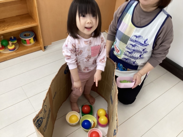 段ボールの中にボールを入れたり、ボールを食材に見立ててお料理したり、段ボールの中に好きなおもちゃを持ってきて自分だけの空間を楽しんだりと色々な遊び方をしていましたよ!