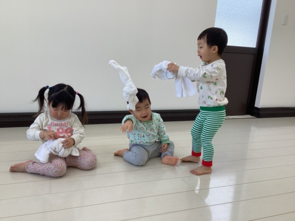 保育者の真似をしながら、結んだタオルをボールのように投げたり、頭に乗せて下に落としたり、バタバタと仰いだりして楽しみましたよ♪