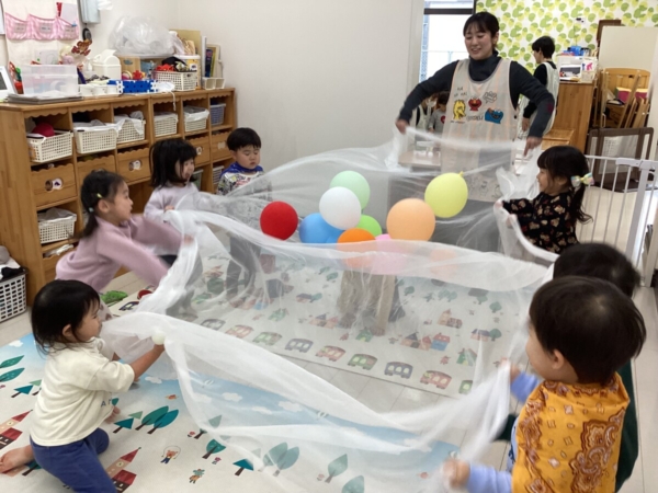 大布の上に風船を乗せてみんなで仰いで遊びました。