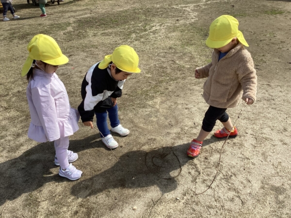枝を見つけるとお絵描きが始まりましたよ。キャラクターの特徴を捉えながら上手に描いていた子ども達でした♪