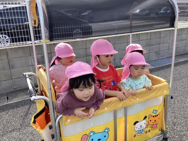 お友だちと一緒に仲良く園庭をお散歩。電車を見たり、ボールを追いかけたり、歩くことがとっても楽しそうでした。