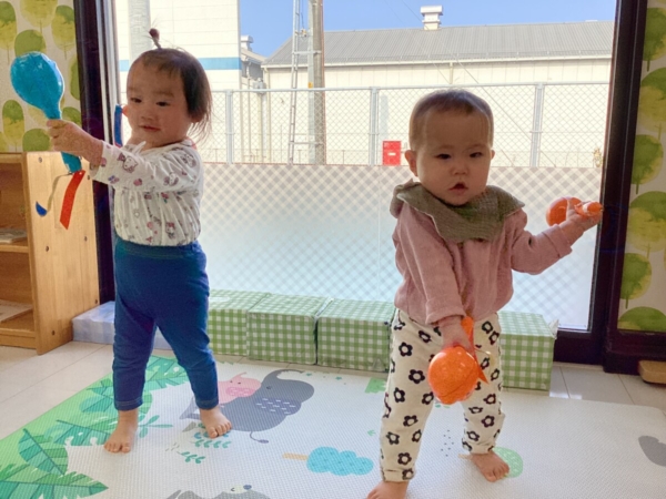 楽器遊びをしました。歌をうたうと、マラカスを持って楽しそうにノリノリで体を揺らしながら踊っていましたよ(^^♪可愛いいですね!