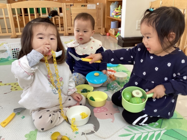 ままごと遊びが大好きなお友だち。食べさせてあげたり、食べる真似では大きな口を開けてモグモグ。その後はお友だちと顔を見合わせて大笑い(*’▽’) みんなで仲良くあそぶ姿にほっこりです(*^^*)