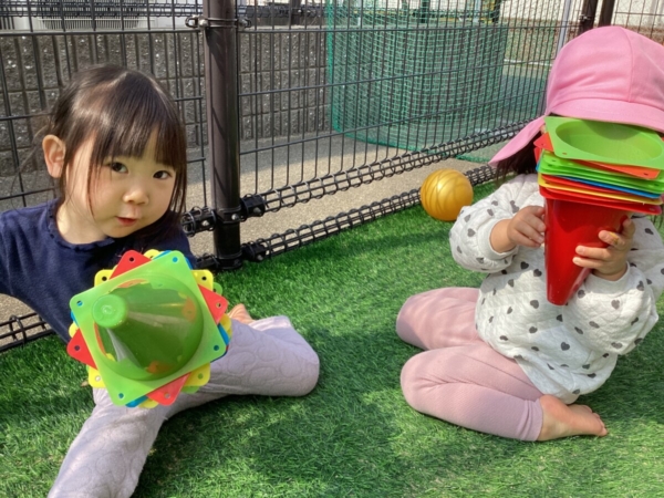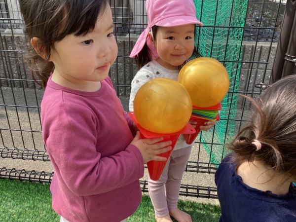 園庭でコーンを使って遊びました。コーンをきれいに並べて置いたり、集めてみたり、ボールを使ってアイスクリームを作ったりと、いろいろな遊び方で楽しんでいました!発想が面白いですよね(^_^)v