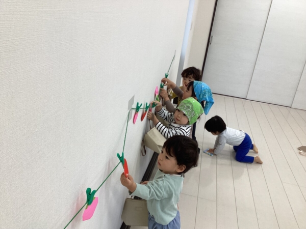 いちご狩りごっこをしました。「いちご大きくなあれ」の絵本を見た後に、ホールでいちご狩りをしましたよ。アイクリップではさんだイチゴをはじめは引っ張って取っていましたが、しばらくするとクリップをつまんで上手にイチゴを取っていました(*^^*)みんな大喜びで、取ったイチゴを美味しそうに食べる真似をしたりと、可愛い姿も見られました。