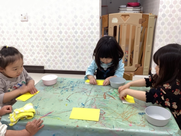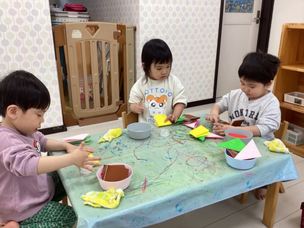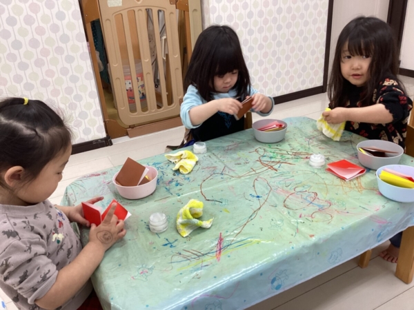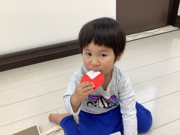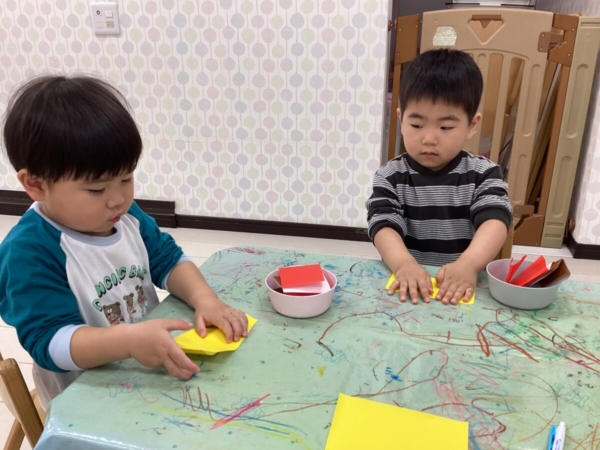 のりをつけ過ぎたら量を調整したり、お手拭きでのりを拭いてから折り始めたりと、いろいろな事ができるようになって感心する場面もたくさんありましたよ(^_^)v
