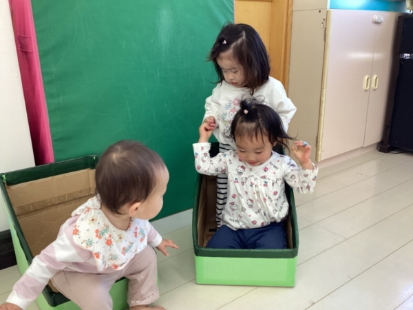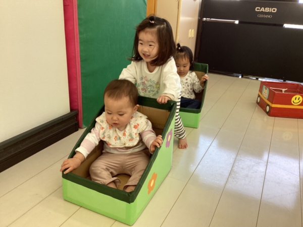 中に座ってくつろいだり、お友だちが乗っている箱車を押してあげる姿も見られましたよ☆とても嬉しそうで微笑ましかったです☺