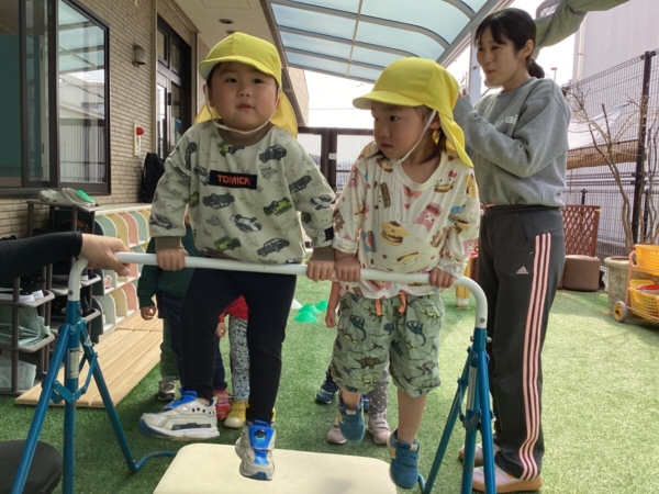 ボールが落ちないように力加減を考えながら、すのこにいる保育者やお友だちに運んでいた子ども達でした!