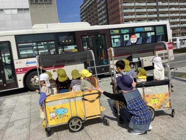 タイヤの大きさに感心したり、「パパとママとバスにのったよ」とお話したり、楽しいひと時を過ごしました♪