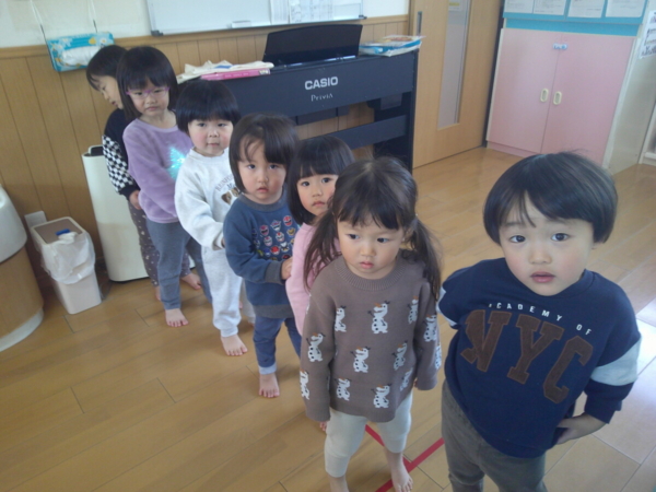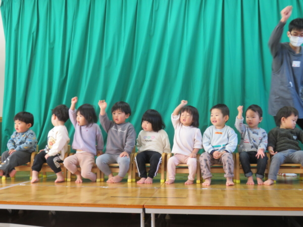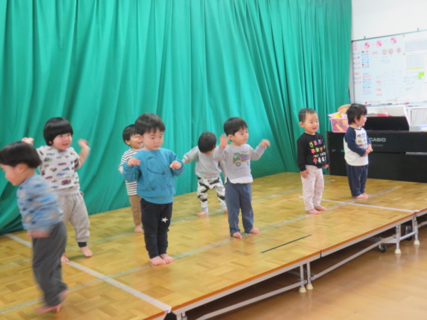 1歳児さんは、お歌やピアノに合わせて身体を揺らしたり、返事をしたり元気に練習中です!