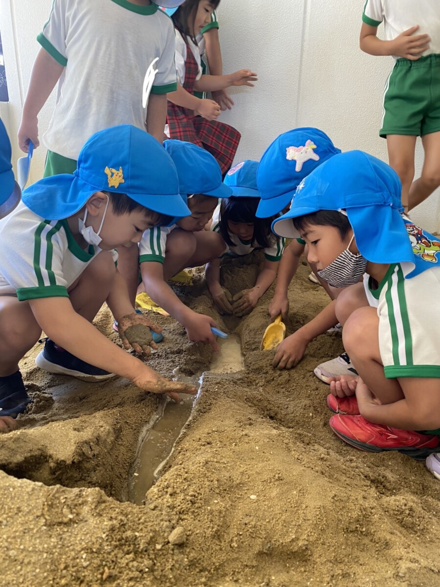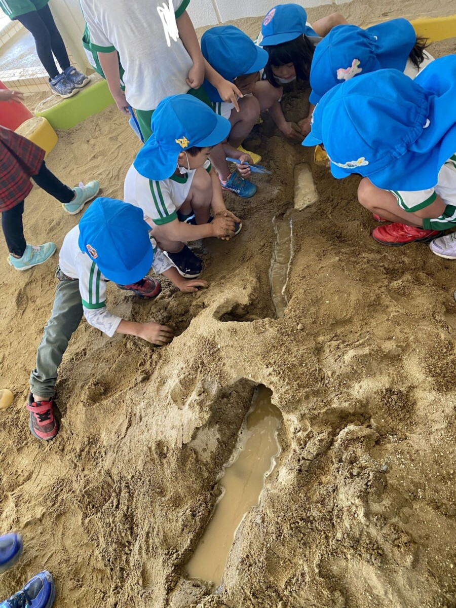 最近の戸外遊びでは、みんなで協力してお砂場でトンネル作りに夢中になる子どもたちです!