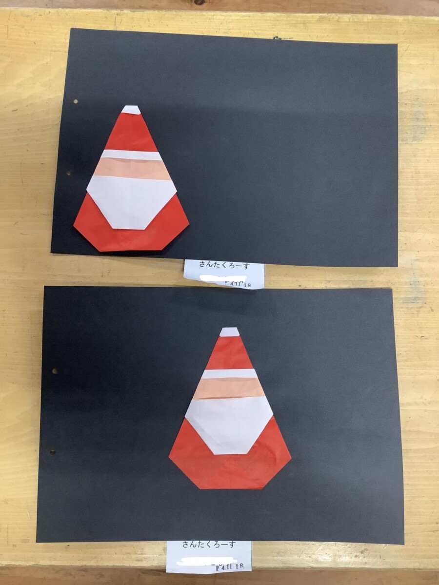 今日は久しぶりに少し早いですが、12月の折り紙製作を行いました!クリスマスにちなんで「サンタクロース」をみんなで折りました。説明をよく聞き、どの子どもも丁寧に仕上げることが出来ていました!今日は、サンタクロースを折って画用紙に貼るところまで行いました。